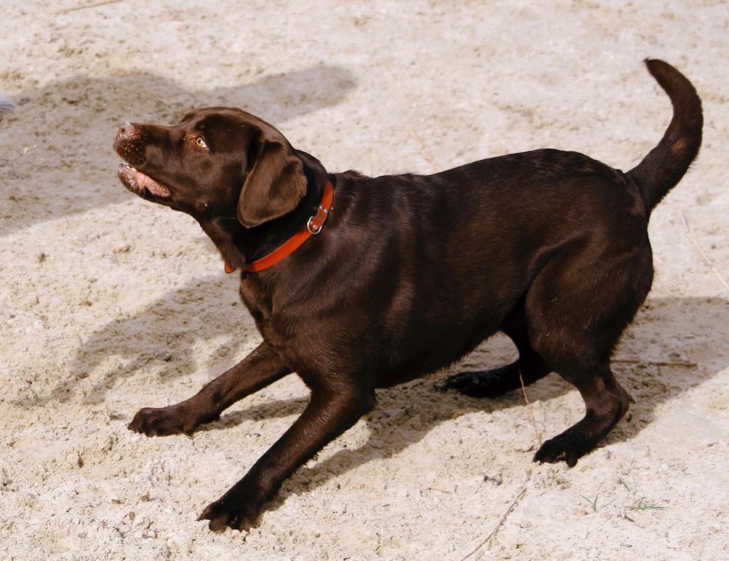 A dog that is standing tall is propped up on her toes with all four paws on the ground, her legs completely straight, and her head held high. Often, a dog’s tail is lifted up when she is standing tall. Standing tall is an assertive move that indicates the dog’s desired dominant status, and it can also be a threat. If the other dog reacts submissively, the interaction will likely remain peaceful. If the other dog reacts assertively, perhaps by also standing tall, the dogs should be separated.